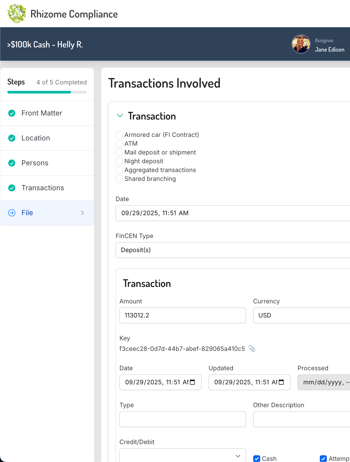 Rhizome's FinCEN automation seamlessly files CTRs for you, directly through FinCEN's APIs.